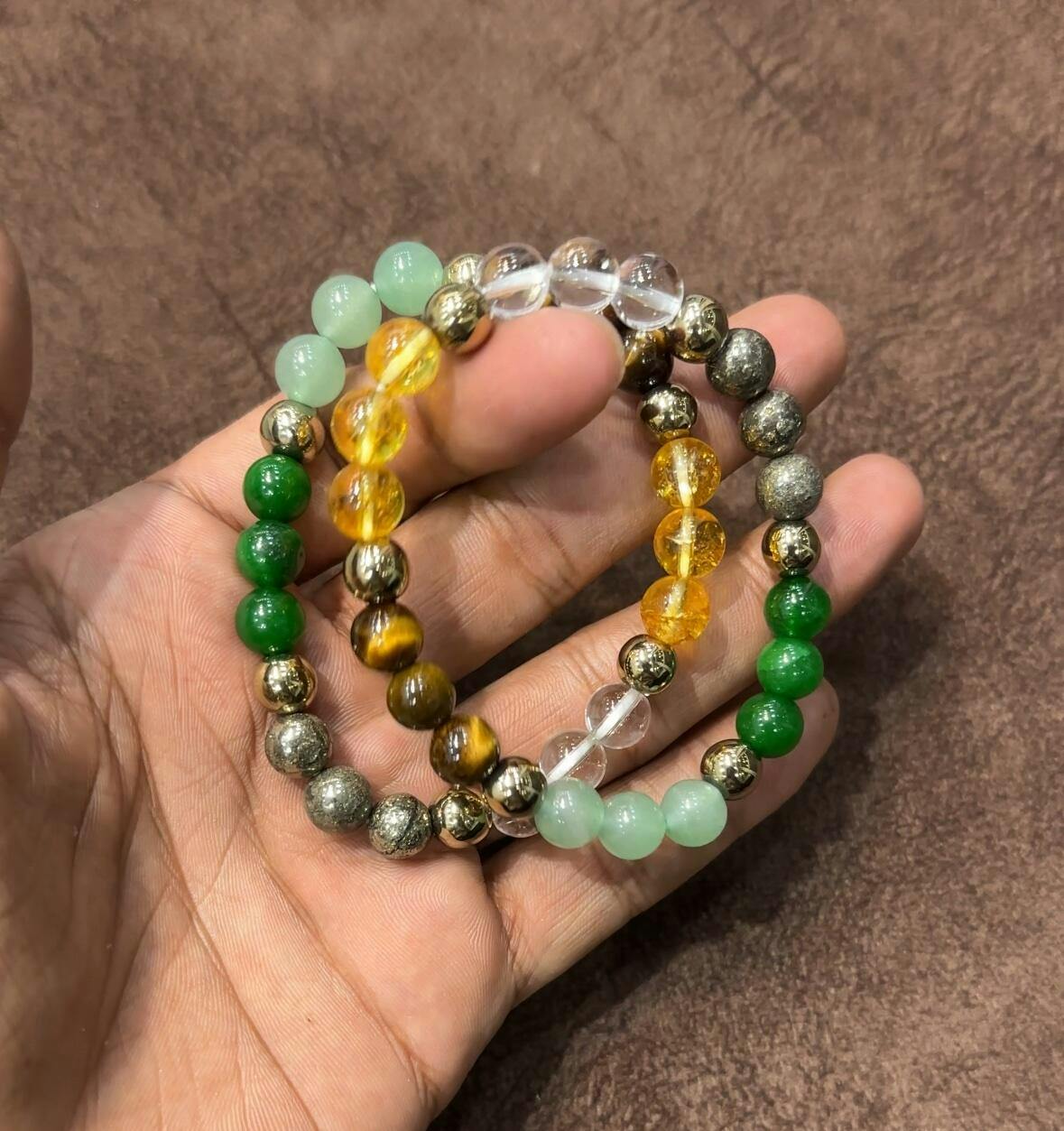 The DhanYog Bracelet is a stylish way to attract financial abundance and prosperity. Crafted with CITRINE, GREEN JADE, TIGER EYE, SPHATIK, GREEN AVENTURINE and PYRITE Stones, known for their wealth attracting properties, this adjustable bracelet is ideal for both men and women. It combines elegant with the power of manifestation, making it a perfect accessory for those seeking to enhance their financial success.